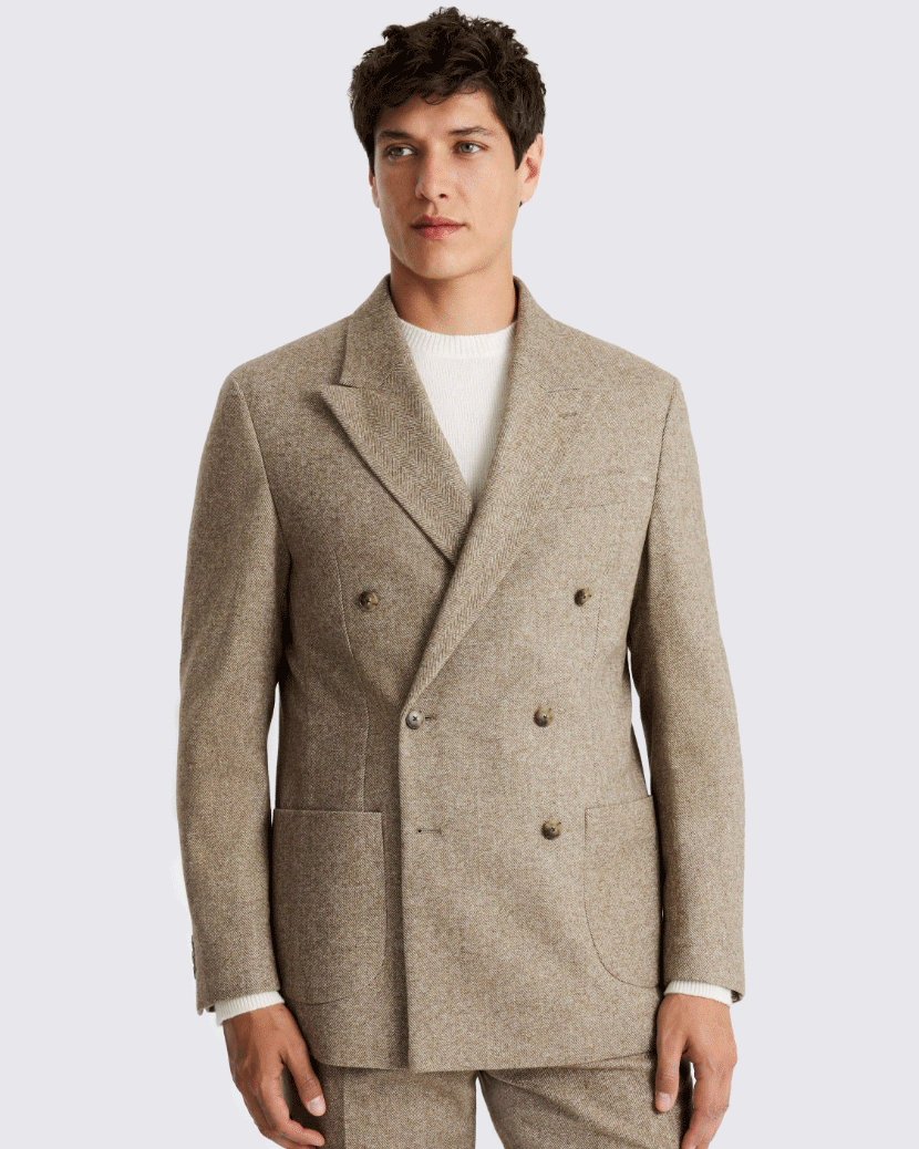 Our gold herringbone-tweed suit comes in an easy-to-layer relaxed fit – all balanced by the gravitas of a double-breasted closure. In a nod to tweed’s fieldsporting roots, the jacket is patched with generous pockets.