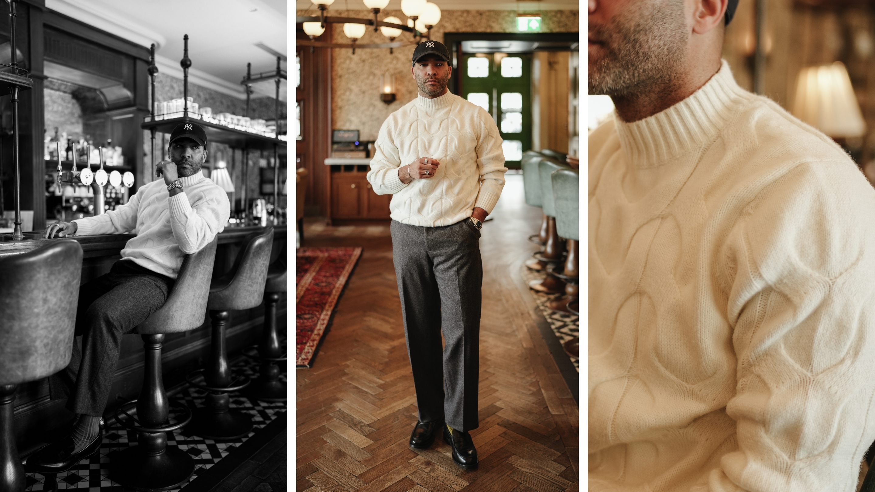 Swap fussy cables for their magnified counterparts to make an instant impression. Case in point: our ivory funnel-neck jumper. Cy teams his with soft flannel trousers and versatile loafers for a look that's considered but understated.