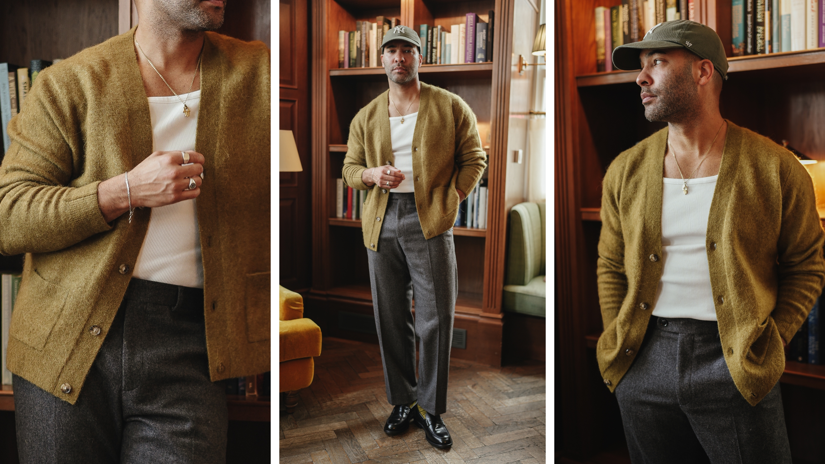 A simple vest paired with tailored trousers might sound unexpected, but layer with tactile knitwear and the look transforms. Cy chooses our cardigan in olive, then slips on loafers to keep the smart-casual feel in check.