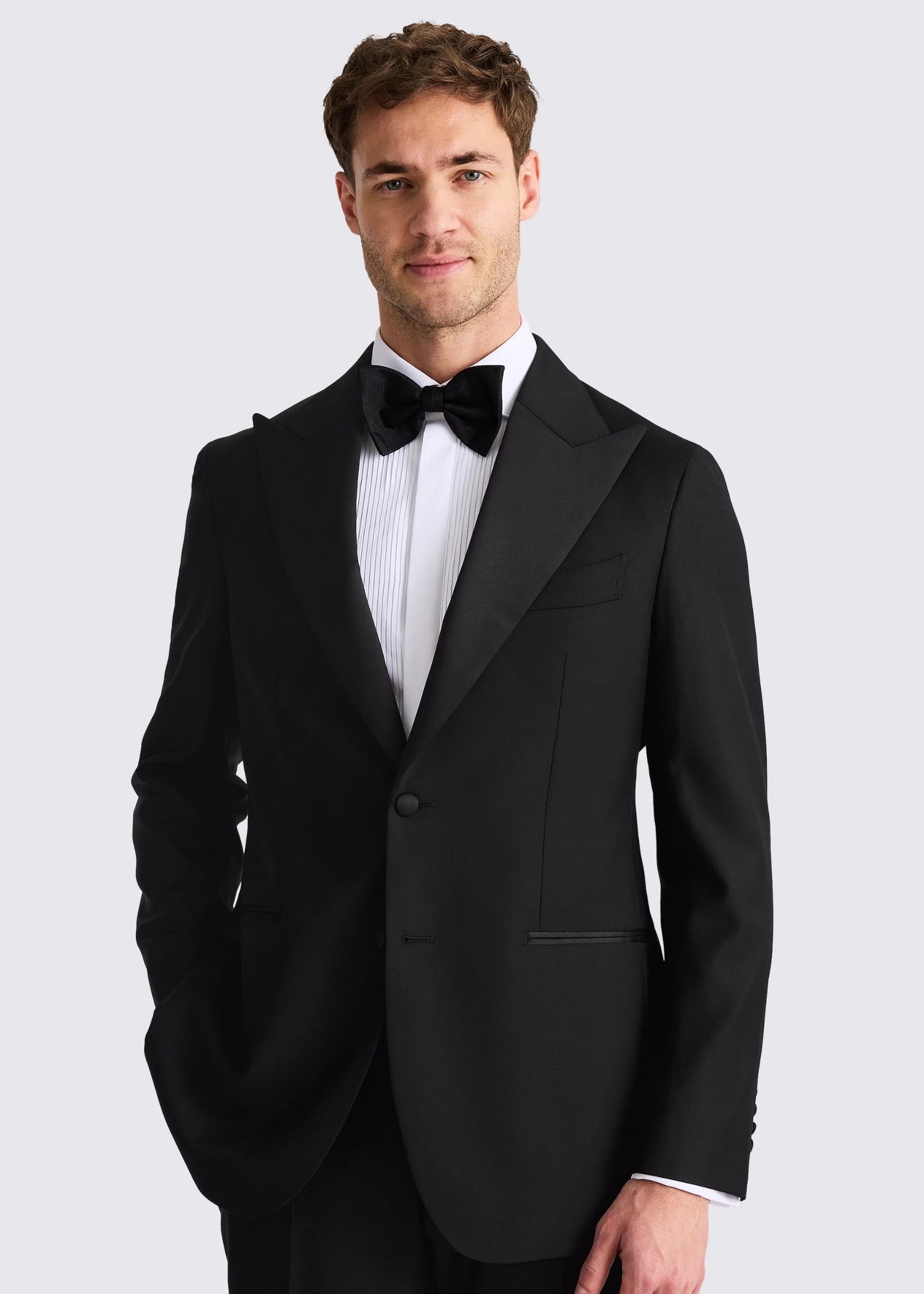 Defined by satin lapels, a wing-collar shirt and bow tie, the tuxedo channels old-school style. Much like a suit, slim, tailored and regular variations of the tux mean that men of all sizes and tastes can pull it off. A pair of black patent shoes, silver cufflinks and smart dress watch often get paired with a tuxedo to complete the polished look.