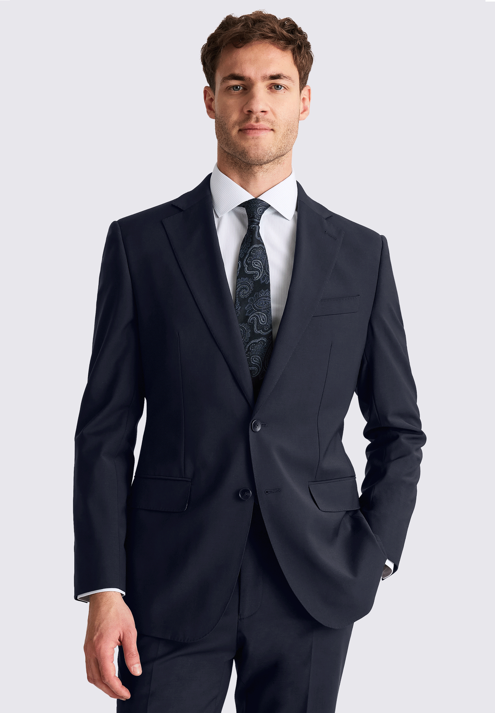 The tailored fit is a great way to accentuate your frame, while still leaving room to breathe. The jacket is gently cinched at the waist and has classic lapels. The trousers are tapered for a polished look. Ideal for guys with a slim, regular or large build.