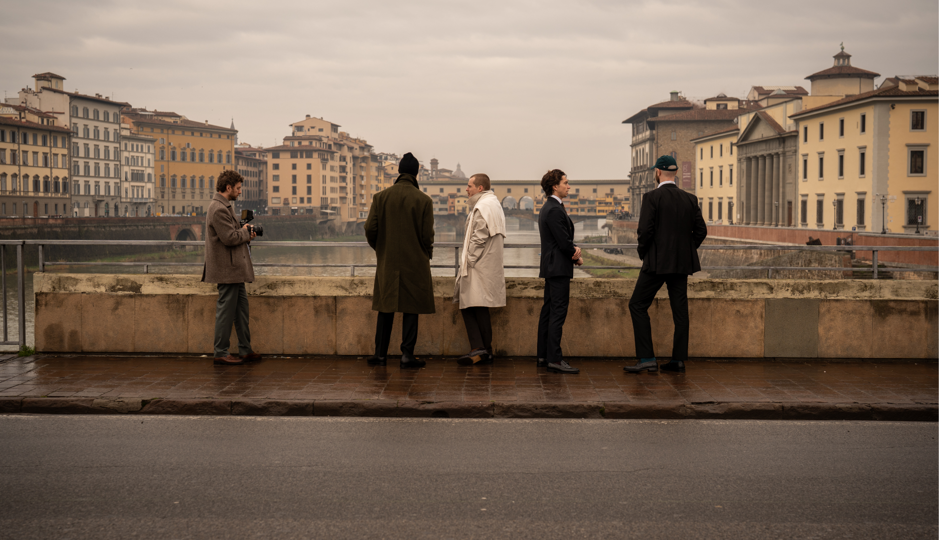 We’re lucky enough to have our friends Rikesh Chauhan, Anton Welcome and Jake Spencer along for the shoot, as we dodge tour groups and nurse another jet-black espresso – taking a moment’s pause by the Arno, where a lone rower braves the cold morning.