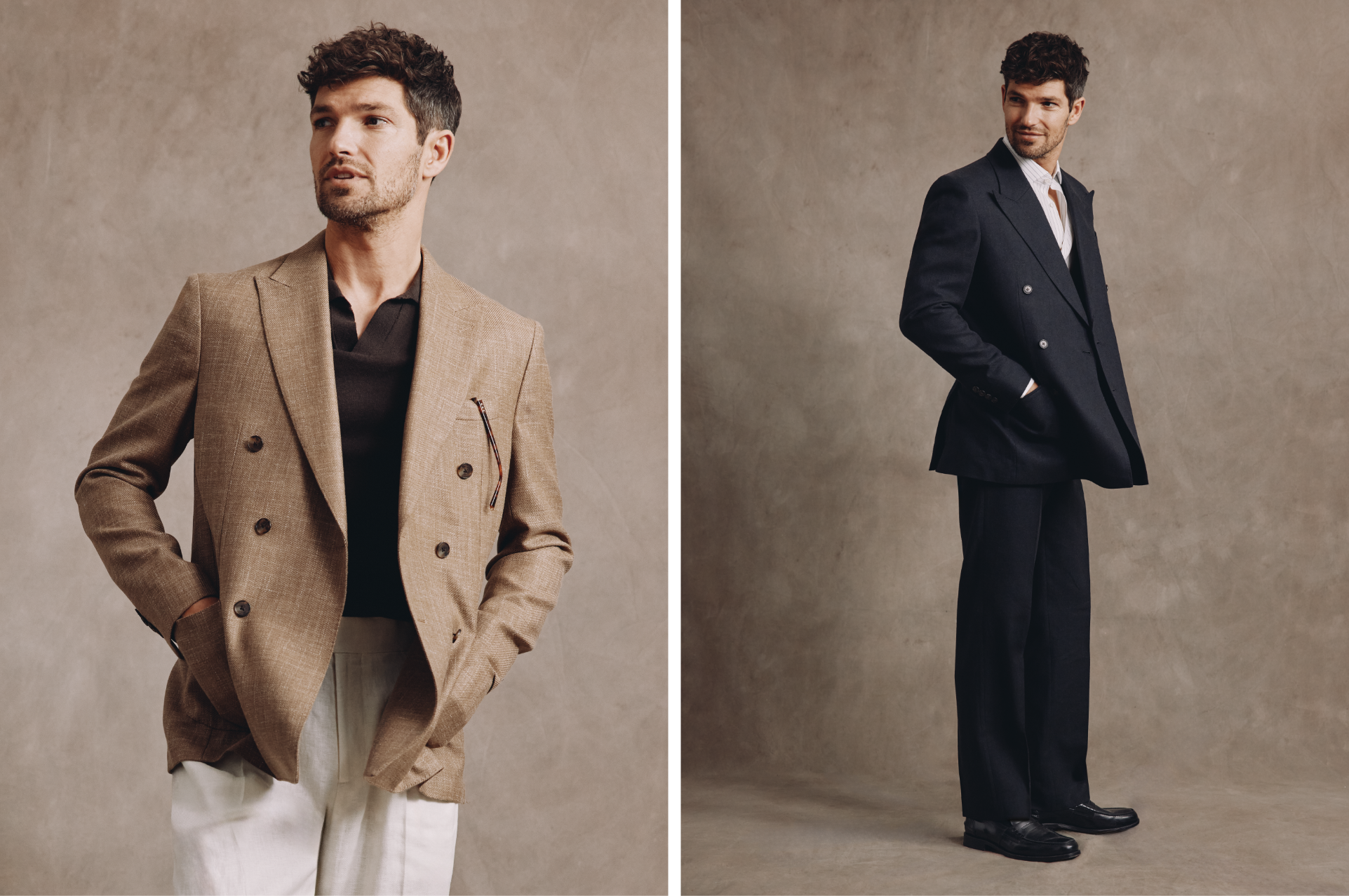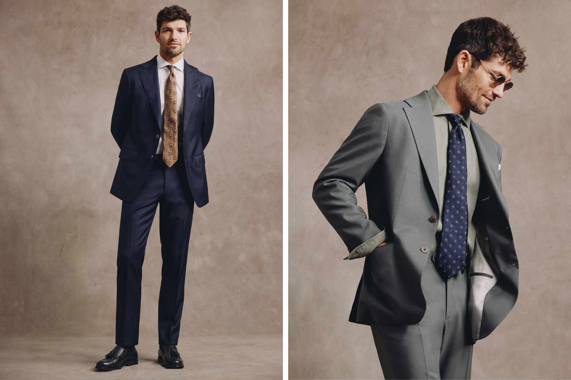 Lounge suits made from the finest Italian-crafted fabrics – like a navy single-breasted style with wide notch lapels, or a muted-sage double-breasted take with jetted pockets – combine tradition with modern elegance.